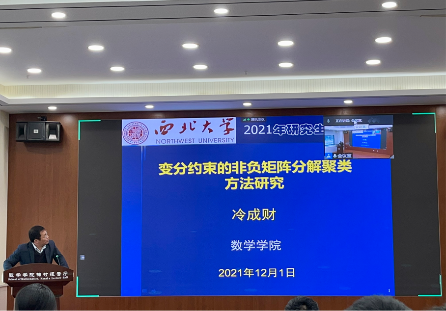 冷成财老师作了题目为《变分约束的非负矩阵分解聚类方法研究》的报告。研究从理论方法到模型研究再到算法研究,通过利用扰动理论和特征描述方法提高图像配准的快速和稳健性;通过利用矩阵分解和规则化方法增强高维数据的鉴别或聚类能力;通过构建重建算法提高生物发光断层成像的精度、速度和稳健性,最终为目标识别与跟踪、图像分割或分类和肿瘤研究提供新技术和新方法。