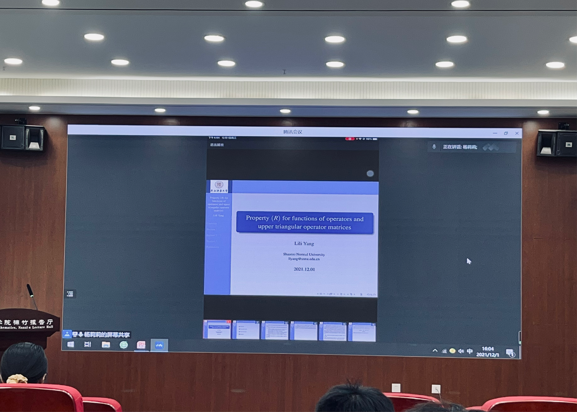 陕西师范大学杨莉莉博士作了《算子函数及算子矩阵的(R)性质》的精彩报告,其中对算子矩阵的研究工作,介绍了Cao-Meng Theorem ,Theorem 4等内容,同学们对于师姐所作内容,分别提出自己的疑问,师姐也给出了详细解答。
