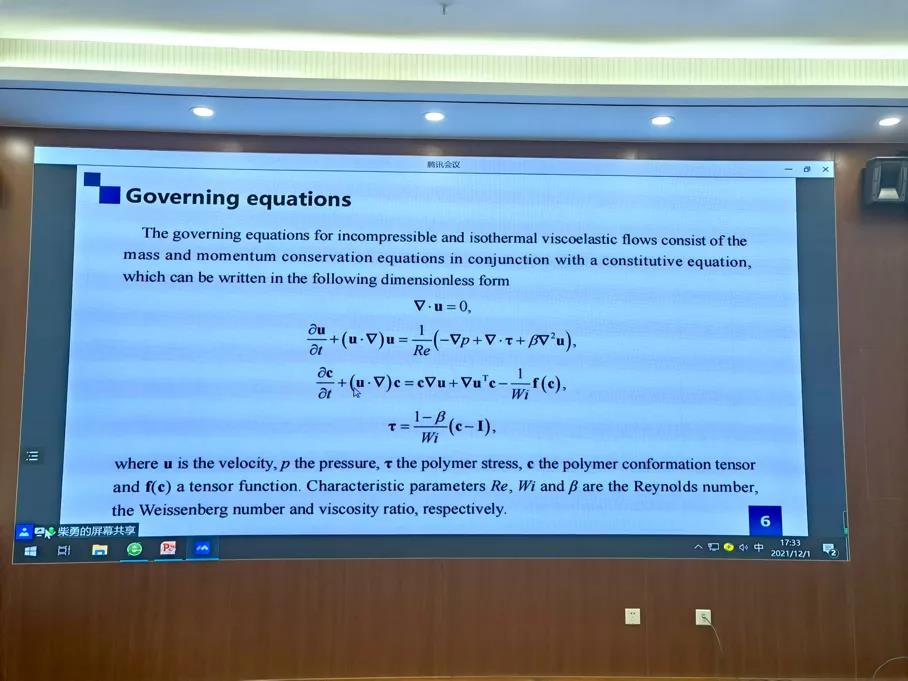 西北工业大学研究生柴勇,报告主题为《The simulaion of viscoelastic flows with stabilized finite element method(FEM)》。主要从研究背景、数值逼近、得到的结果等六个方面进行了阐述,报告首先对流体进行了简单的分类,然后说明此次报告中主要使用的是有限维的方法,即用多项式逼近无限维空间。然后介绍了粘弹性流体控制方程的两种求解方法的大致步骤。紧接着在报告中分5步展开介绍了粘弹性流动的稳定化有限元模拟,最后在报告中展示了数值逼近能够得到良好的结果。
