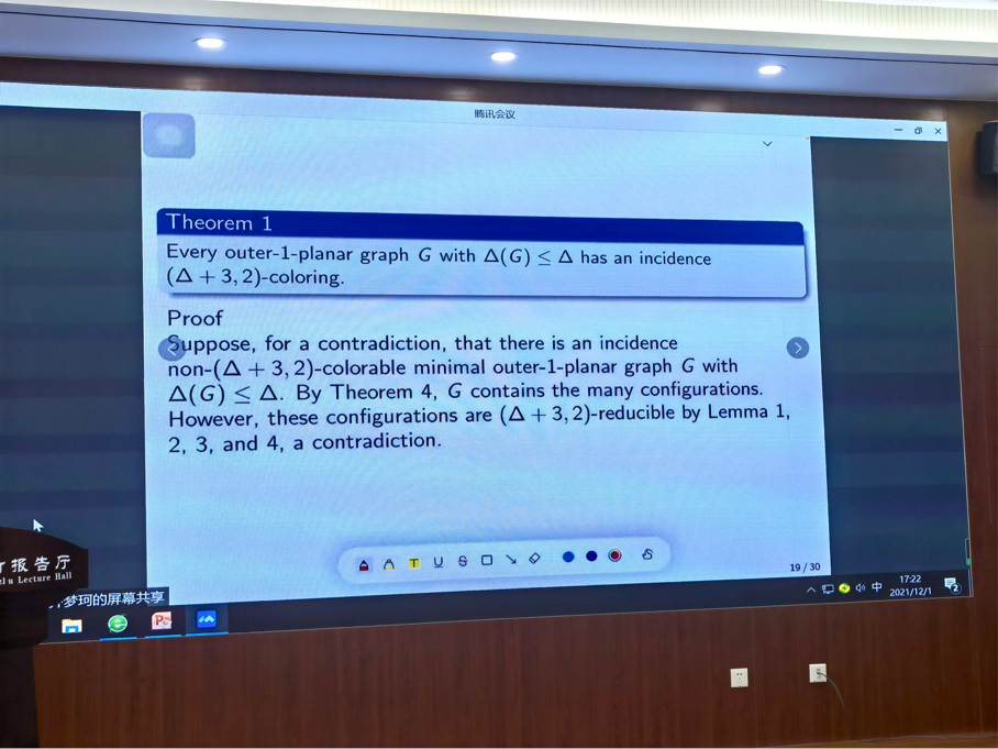 西安电子科技大学研究生齐梦珂,报告主题为《Incident coloring of graphs》。报告开始先介绍了图以及平面图的相关基本概念,如顶点、度、弱关联等概念,并介绍了一些前人的经验成果。然后主要从外-1平面图出发,阐述了研究中主要用到的约化结构的方法。报告中介绍的主要成果为证明了四种结构是(△+P,2)是可约化的。