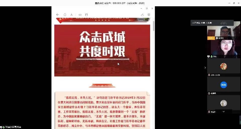 本科生党支部学习观看视频《习近平时间》,视频中体现了“人民至上、生命至上!”的宗旨,让人民深切感受到党和国家的关怀。新冠肺炎疫情发生以来,习近平总书记心系万家冷暖,情牵百姓安危,亲自指挥、亲自部署这场人民战争、总体战、阻击战,充分彰显了“以人民为中心”的执政理念。